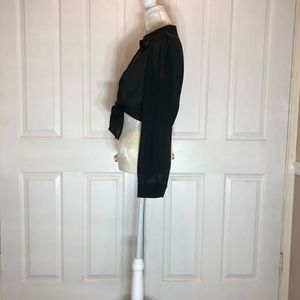 This is an adorable black shell that goes great over a fancy dress or t-shirt with jeans. Black beading around the collar. Front tie. 100% polyester.