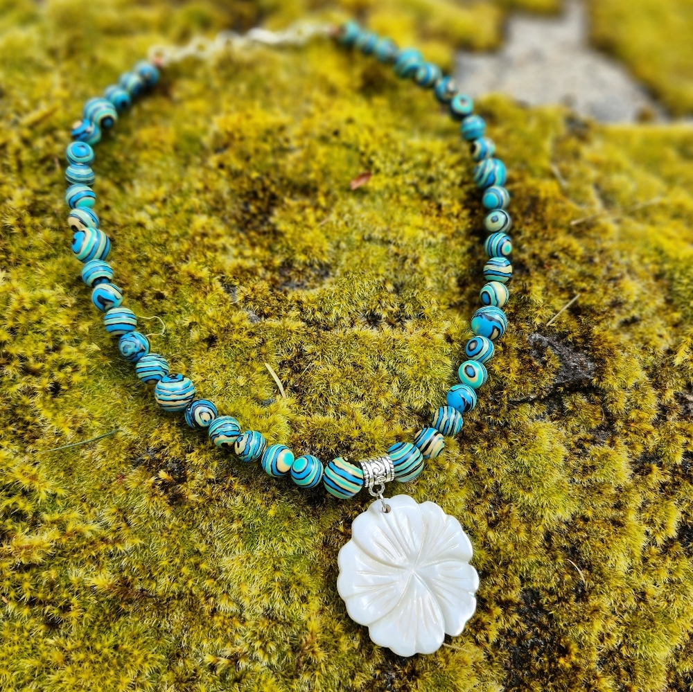 I made this necklace with synthetic blue colorful Malachite beads and a real shell flower pendant! it's my favorite necklace I've made so far! it's on rose gold 18 gauge wire. I love wire necklaces because they hold a U shape, rather than a chain V shape.