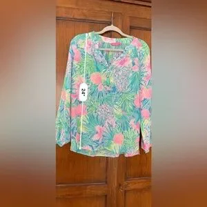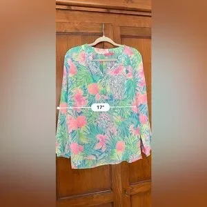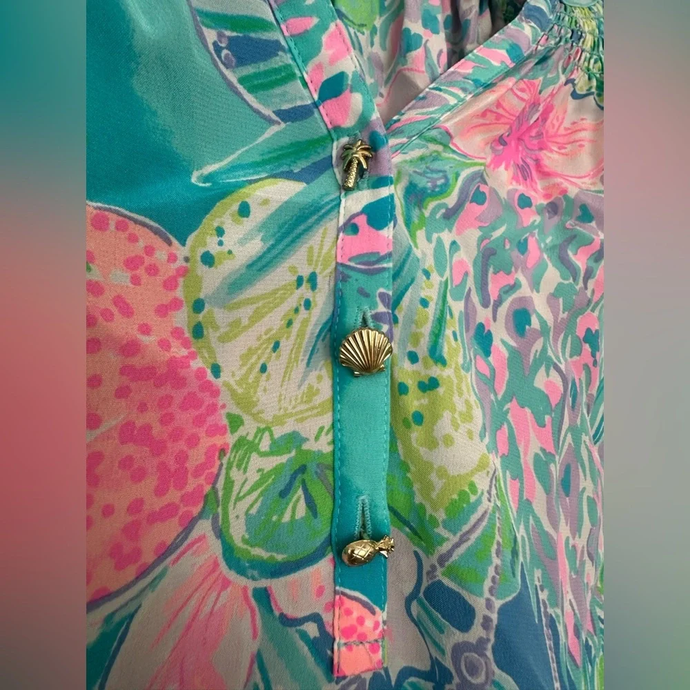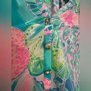 Lightweight tunic with vibrant tropical print. Turquoise, pink and lime green palette. Decorative gold shell and fish buttons. Easy, breezy summer piece. See measurements for potential size. I believe it is a L or XL but don’t know.