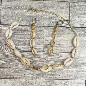 Shell Earring and Necklace Set. Earrings measure 3”, necklace measures 16.5” (adjustable to shorter size). Good condition.