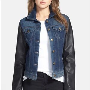 All you need to amp up your urban attitude is a classic denim jacket finished with black faux-leather sleeves.