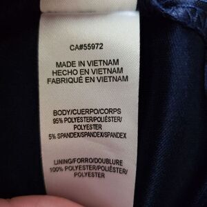 ~ Description: Blue, green, pink and purple retro floral pattern, shift dress, stretchy material, 3/4 length sleeves, scoop back with strap, lined except the sleeves