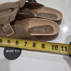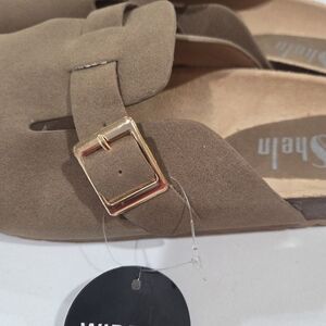 Chic brown mules by Shellys London. Features a stylish gold buckle. Wide fit for comfort.