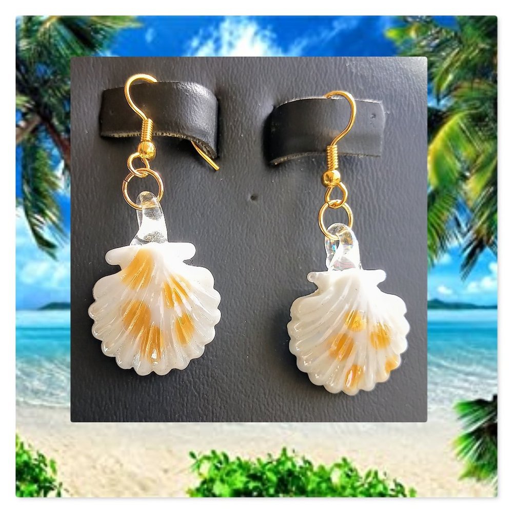 White scalloped shells, touch of beige spots with gold-filled ear wire hooks