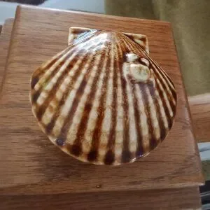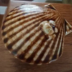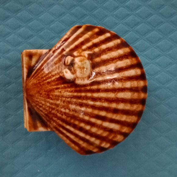 Vintage 70's...Glossy Ceramic Shell-shaped Trinket Box...hinged top and gold-toned metal footed bottom...2" high x 3-1/2" wide...red velvet inner lined...shows a small crab crawling on the top...JAPAN is on the bottom...no other maker marks or IDs...no cracks or chips but laquer is worn away along the rim...see last photo...pre-loved in good vintage condition.