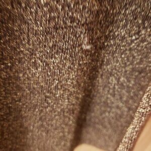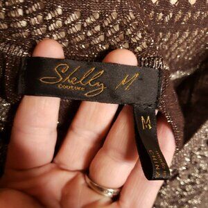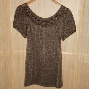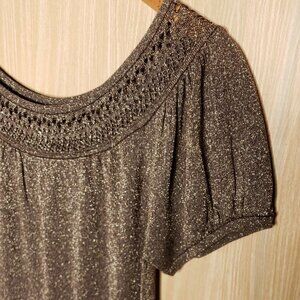 Shelly M. Couture women’s gold sparkle knit short sleeve lightweight tunic sweater medium. Gold sparkle with brown under. Good condition, there is one small snag on back (see picture) Measurements are: 30” from shoulder to hem, and 18” from armpit to armpit.