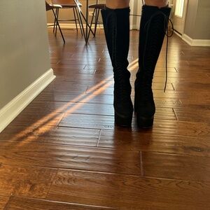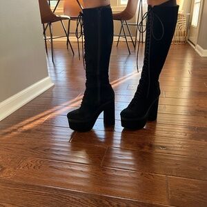 knee-high lace up black suede-like platform boots. Zips on inside calf area for easy on and off. Some deterioration on inside by ankle area and scuffs on exterior (see photos)