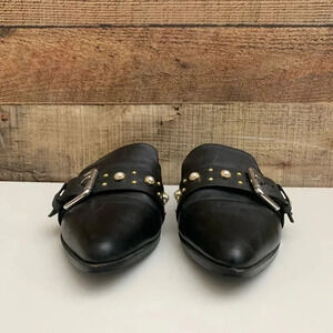 -Shining studs and luminous imitation pearls grace the buckle strap of an ultra-svelte mule cut with a low block heel and wickedly pointy toe. - 1" heel * Imitation pearl size: 8mm *Leather upper and lining/synthetic sole