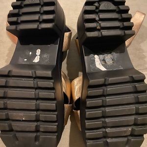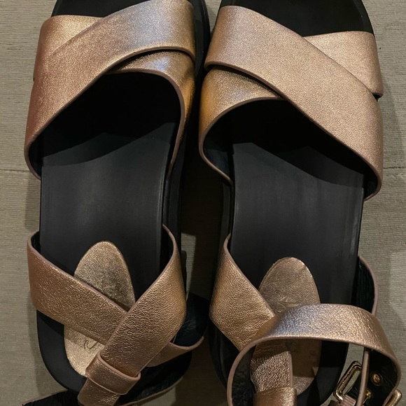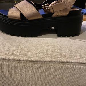 Shellys London Metallic leather crisscrossed ankle strap platforms sandals. NWOT