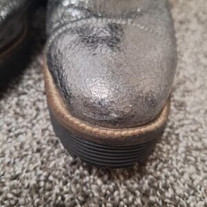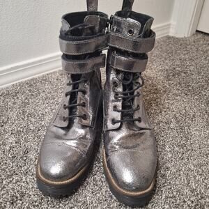 Shellys London genuine leather crackled silver combat boot. Adjustable straps and side zipper. Size 38 or US size 9. In excellent condition with minor scuff near toe see photo.