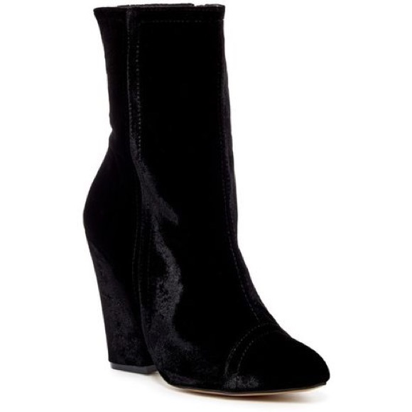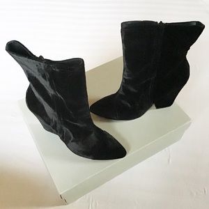 These are brand new in box (never worn) calf-height velvet boots with some top stitch detail. They have a pointed cap toe and padded footbed for comfort. The heel is approximately 4”