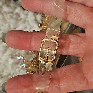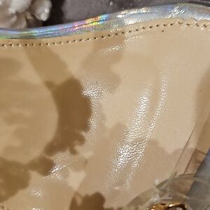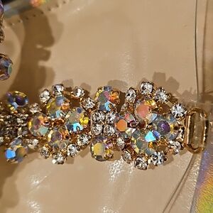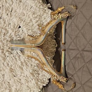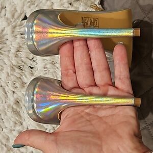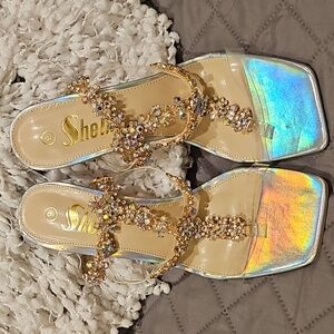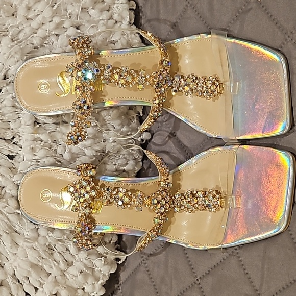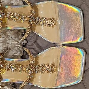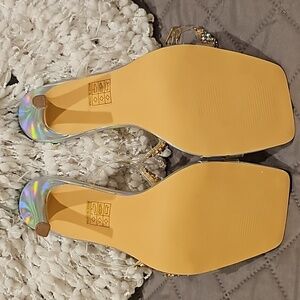 Sheln Jewel Rhinestone square toe heels size 9, clear straps, adjustable buckle ankle strap, silver hologram toe bed base and heel, 4.5" heel, small part of rhinestones need a dab of glue, new without box, see all photos for details!