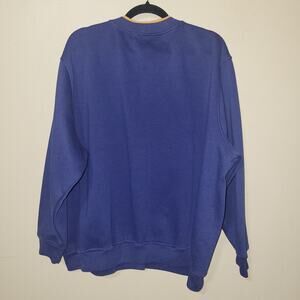 This is a Shenanigans brand vintage floral embroidered cardigan sweatshirt. It is a blue, button-up sweater with a collar and embroidered floral designs down the front. This style is often associated with 1990s streetwear and is sometimes referred to as "grandmacore" or "cottagecore". The design features a layered look with a yellow collar underneath the main blue layer.