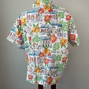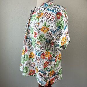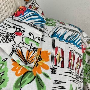 Colorful, fun and unique button down shirt by Shenanigans. It measures 23 inches armpit to armpit laying flat 24 in length from shoulder to hem.