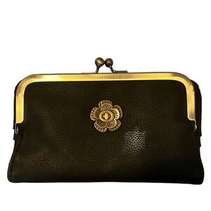 Sheng Tong Clutch Wallet Black Faux Leather Metal Flower Snap Clasp EUC