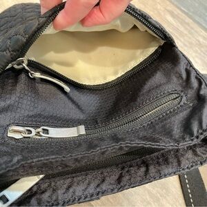 Great crossbody bag with adjustable strap. Large back pocket. Zippered top. Two front zippered areas. Quilted front with floral motif.