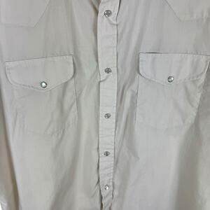 Excellent preowned condition. Cream short sleeve collared pearl snap up lightweight Western shirt. Has peal snap flap pockets on chest. Cotton/polyester material. Approx. measurements: Shoulder to hem 30", pit to pit 26". Men's Size 17.5 Neck.