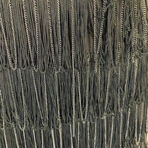 Unique, sexy and fun. Black loop and gold chain fringe. Spaghetti straps and side zip in a mini skirt length. Approx measurements pit to pit 15 and length 36 inches. This is a substantial dress. I think there are 8 total chains that are not looped. It is hard to tell. Could be stitched back or cut. Otherwise lovely condition.