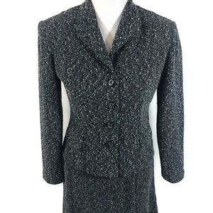 In pristine condition!! And this set seems to be vintage by looking a tag. Two piece skirt suit in a black and white material. Size 6P, has shoulder pads that could easily be removed if desired. 69% polyester and 31% rayon