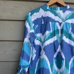 Add a pop of color to your wardrobe with this stunning Sheridan French ikat print dress in ocean blue and turquoise tones. Crafted from soft breathable cotton, this tiered tunic silhouette features 3/4 bell sleeves, mirrored embellishment along the neckline, and a relaxed yet flattering fit.
