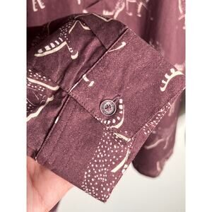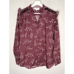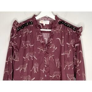 Sheridan French Embellished Aubergine Cheetah Ruffle Long Sleeve Blouse Medium