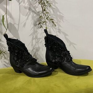 Sheridan Mia Chic black leather ankle boots with floral accents. Stylish and comfortable for any occasion. Excellent condition, worn 2x. Size EU 41 (US Womens 10) Short block heels. Small scratch on back of right heel (see photos). Open to offers!