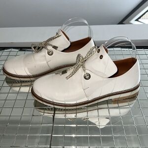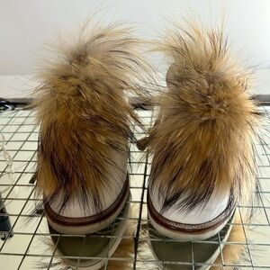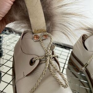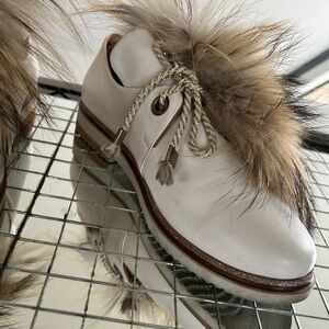 This is a beautiful pair of Sheridan Mia Sz 39 Lace Up Cream Leather Oxford with Detachable Fox Fur Top. Lightweight, full leather interior and exterior non slip bottom. Beautiful lightly metallic layer on the sole. The fur snaps in and out with double snap. Original metallic braided laces. Perfectly fits a US Sz 9. Minor scuffs and scratches. No odors.