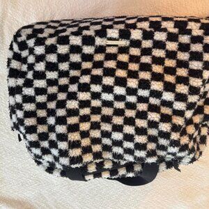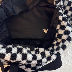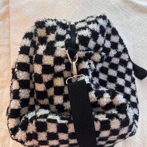 Madden girl Black and white checkered Sherpa duffle overnight bag with mesh compartments, adjustable straps, and a zipper pocket #travelbag