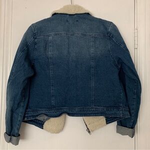 Warm Sherpa lined Jean jacket with a fun asymmetrical zipper and a unique collar design. Used in great condition, no flaws. Machine washable. Size M but fits a little cropped so it can easily fit a size S.