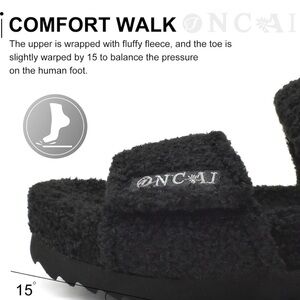 Cute Women’s Slide Slippers:The upper is made of curly faux sherpa and polar fleece lining with memory foam which is warm and feeling cozy.Slip-on and open toe design will let your feet more free and easily wear.