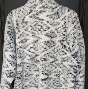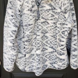 Gently used sherpa pullover. Very soft and fluffy, perfect for winter. Colors are white and black with a subtle tribal pattern. The tag calls it grey ikat.