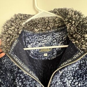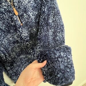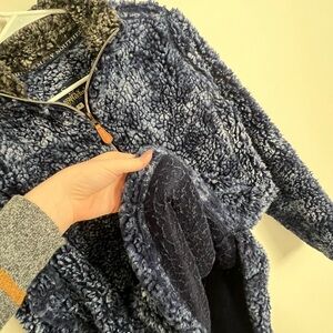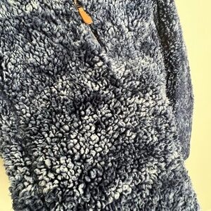 Coziest and dreamiest blue/grey/black Sherpa wear! Inside is lined, and does have some pilling as well as a bit of “flattened” fluff around the edge of the sleeves. Overall, has only been worn a handful of times. Size small, but fits much much closer to a M/L or oversized Small.