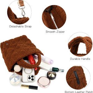 Features: This plush, fuzzy tote is made with high-quality sherpa and durable polyester lining. Its quilted style makes it super trendy and versatile — perfect for elevating any outfit. The spacious interior has a main compartment, zipper pockets, mesh slip pockets, and even a cute coin purse to keep your essentials organized. Lightweight enough to carry comfortably, it comfortably fits your phone, lipstick, wallet, sunglasses, and more.