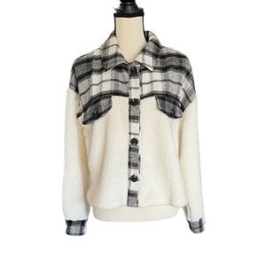 Sherpa button up plaid trim button waist length shacket. Size Large
