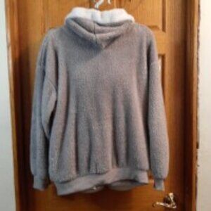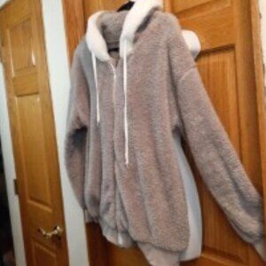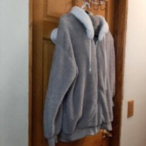 Warm Sherpa jacket can be worn by anyone from kid to women. Gray and white with a hood. Pit to Pit measurement is 23 inches and shoulder to hem is 27 inches. neckline to end of sleeve cuff is 28 inches