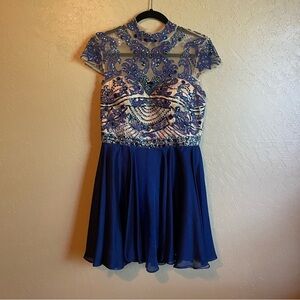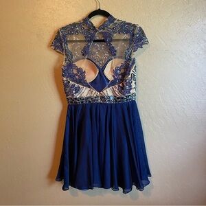 Let your inner fashionista shine with this stunning high neck evening gown by Sherri Hill for your next big event. Fitted from the high cap sleeve neckline to the natural waist, this gown hugs your curves as intricate all over beadwork sparkles and shines in the light. The asymmetrical chiffon skirt billows gracefully into a classic knee length hem as the waist cinches in gracefully with stunning beaded detail. Perfect for pageants, homecoming court, and other formal events this gown is sure to be a showstopper making it a must have for your formal wear wardrobe.