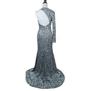 Sequin fitted gown with asymmetrical neckline, one shoulder long sleeve and a high slit.