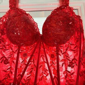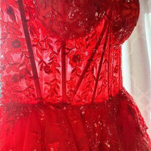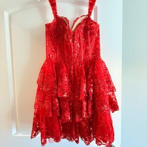 Sherri Hill 55785. Tulle sequin A-Line cocktail dress with sheer corset bodice, off the shoulder straps and ruffle skirt (Attributes: A-Line, Sweetheart, Short) Color is red. Worn 1 time for about 3 hours. Has been kept in garment bag. Size 8. Please ask if you want close up of any part of dress.