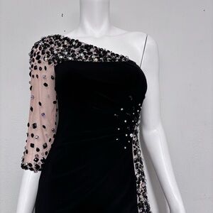 Sherri Hill Black One Shoulder Dress Size 4 in good condition may have a couple of beads missing on the bottom of hand sleeve noting major dress still looks stunning see pics beautiful dress