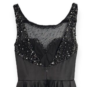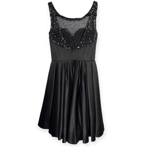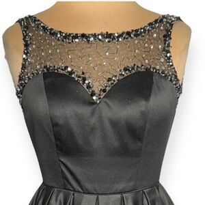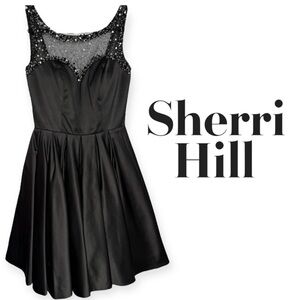 Sherri Hill Black Satin Fit and Flare Dress with bead and sequin embellishments