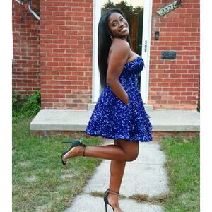 Sherri Hill Blue Sequin Strapless Boned Corset Cocktail Mini Dress Size 10. A beautiful cobalt blue strapless dress with a sweetheart neckline, boned bodice, flowy skirt, and hidden back zipper closure. A-line silhouette. Mini length.