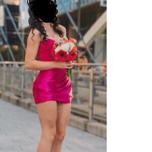 Bright pink strapless fitted cocktail dress featuring a sequin lace corset bodice with keyhole detail and a ruched skirt. Gorgeous, bold, and eye-catching!