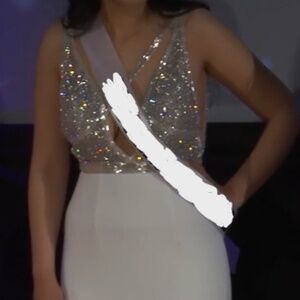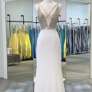 Ivory jersey gown with Swarovski crystal bodice and liquid beaded criss-cross. Dress has been hemmed and train removed.