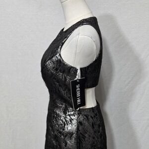Details/Tags: Hang tag reads SHERRI HILL; secondary tag lists Color: silver, Size: 4, and "Register your Dress at: " with Serial Number: 165272-96475-6-4-000