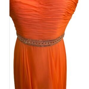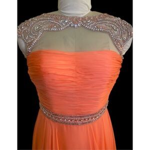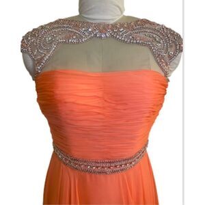 Gorgeous formal gown by iconic Sherri Hill. Worn once in 2015 - has been hanging in the closet ever since. Jeweled bodice and waist, back zip. The color is more peachy than orange. Flowy and makes a stunning silhouette.
