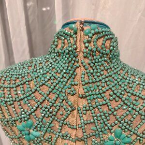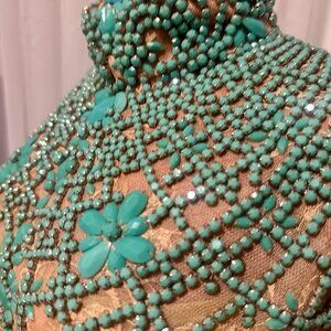 Turn heads in this Sherri Hill top-and-skirt set, featuring a nude base adorned with teal jewel embellishments. The turtleneck short-sleeve top pairs perfectly with the matching jeweled skirt, creating a cohesive, sparkling look ideal for proms, galas, or evening events. A rare find — this style is out of stock in most places and highly sought after!