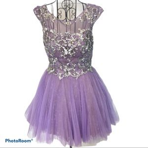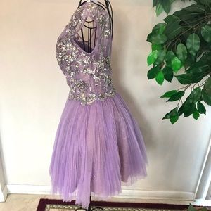 Lavender Sherri Hill sequin bodice with Tulle skirt for that flowing, bouncy full skirt. Size 8. Padded built in bra. Deep V in the back. Rear zip. Prom Cocktail dress. Approximate measurements: