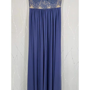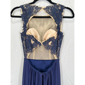 Simply gorgeous and timeless formal gown. Beige mesh illusion top panel with padded cups and navy blue lace adornment.