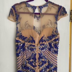 Sherri Hill prom dress in the style 1939 in a size 10. It has a high neck with a beaded bodice and capped sleeves. The beads trail into the tulle skirt. There is some discoloration under the train as shown in the pictures, but once the dress is on you won’t be able to see it. No missing beads in the bodice