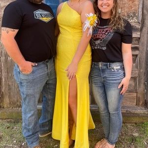 This is a 2022 Sheri Hill. One shoulder with leg slit. The material is spandex like with rhinestones over top. WORN ONCE!